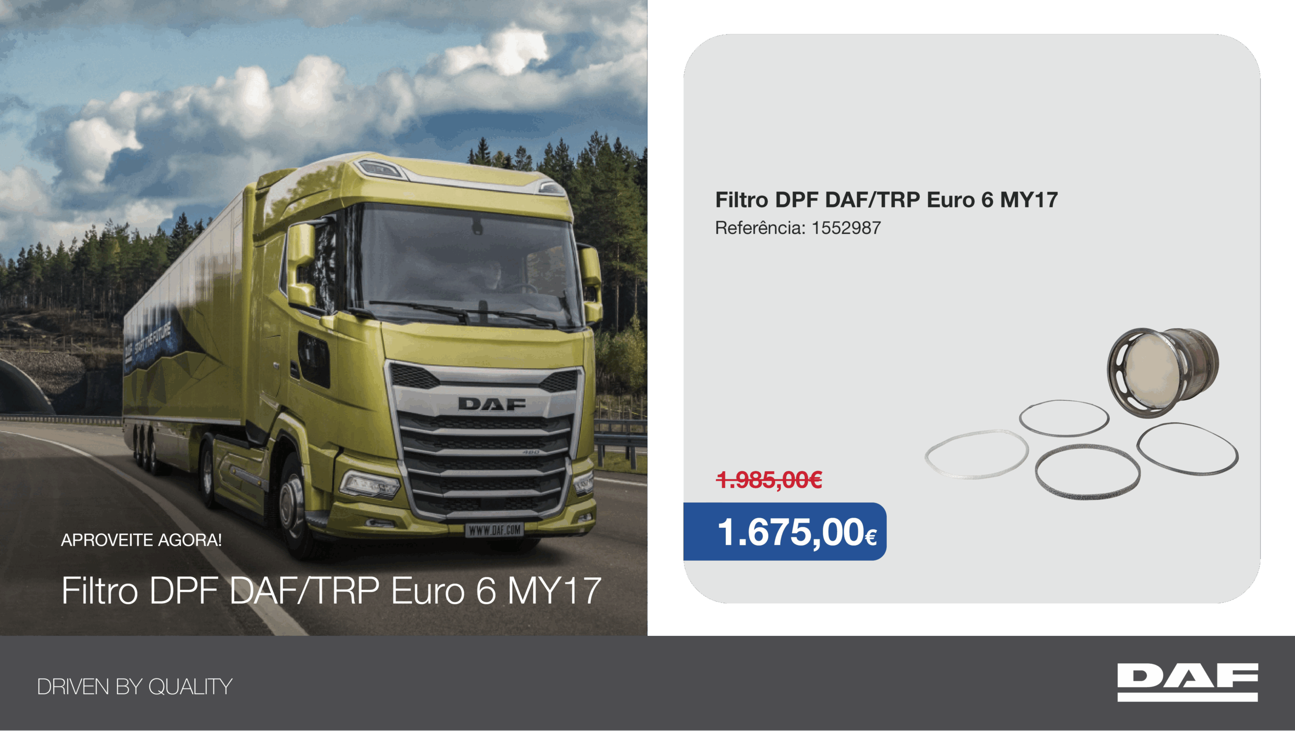 O Filtro DPF DAF/TRP Euro 6 MY17 está disponível com um preço ainda mais competitivo para reduzir os custos de manutenção da sua frota.